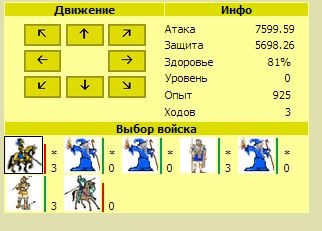 По параметрам юнитов все нормально? Соответсвует написанному на главной странице? Пикеса превратил в птичку... Пик- 1500- А-6 З-6 - ходов 8. Указано в параметрах 1600 - 4-4 - 12. Я уж не помню как было в действительности, поэтому пишу )) по остальным как интересно? никто не заметил разницы? При накоплении опыта параметр атака-защита прибавляется онлайн? или после перехода? не заметил( помоему онлайн - это правильно?